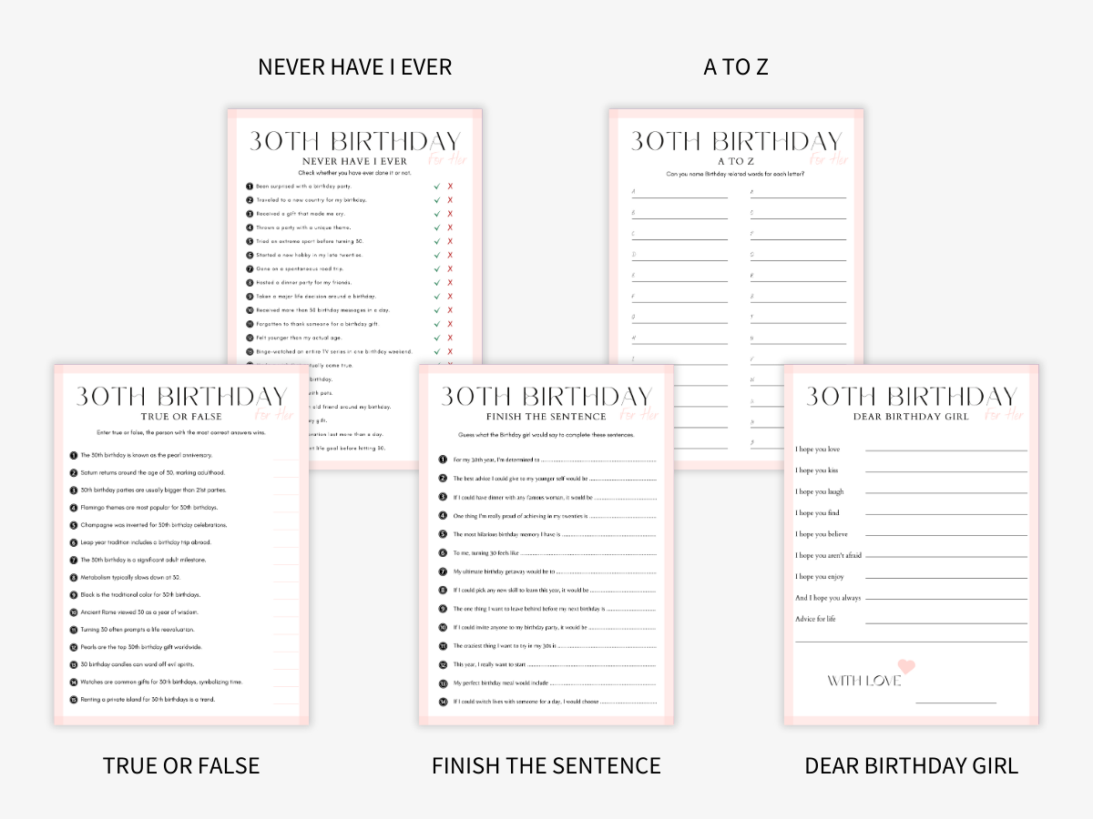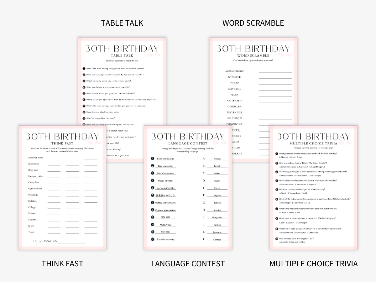 Turning 30 is a big moment, so make it unforgettable. This printable 30th Birthday for Her Games Bundle adds excitement, laughter, and fun to any celebration. Everyone will enjoy these entertaining games while making great memories.