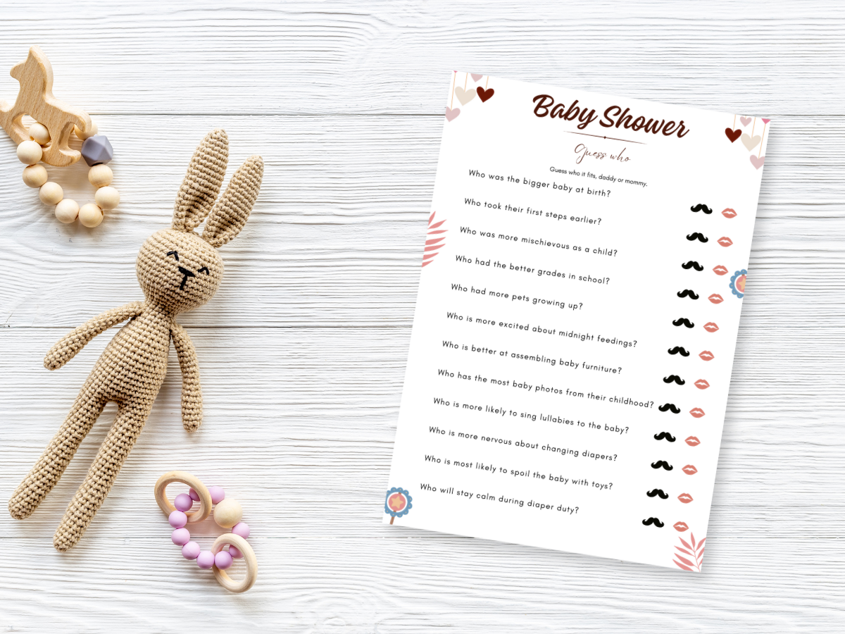 - 1 Printable Baby Shower Guess Who Game Sheet with 12 Parent-Centric Prompts