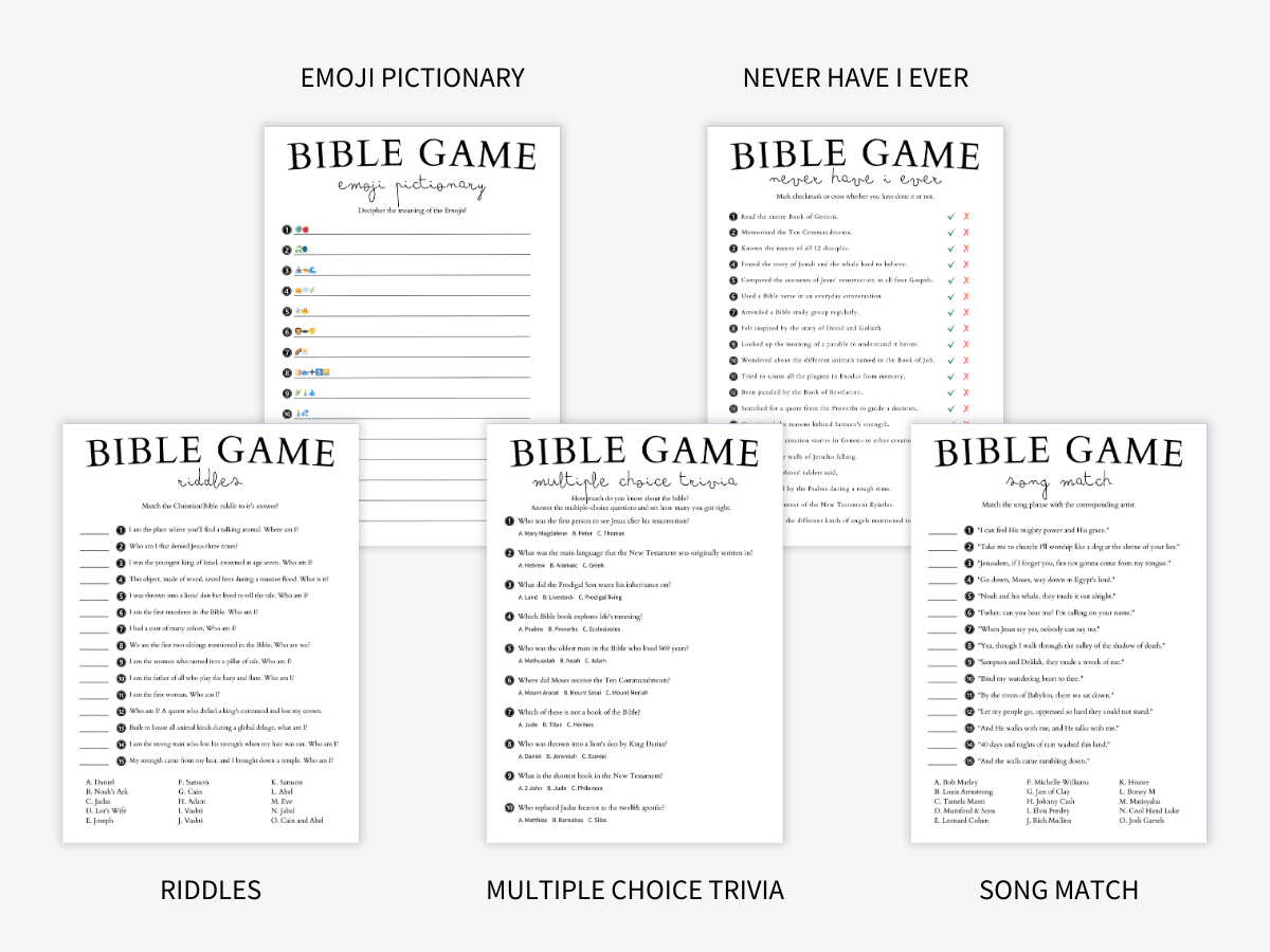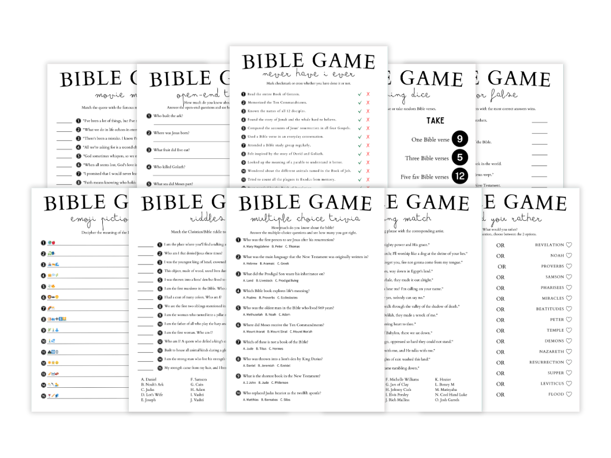 Bring your gatherings to life with the Ultimate Bible 10 Printable Games Bundle! This incredible collection of 10 engaging, scripture-based games is designed to entertain, educate, and inspire players of all ages. Perfect for family nights, church events, Sunday school, and youth group activities, this bundle is packed with joy, learning, and faith-centered fun.