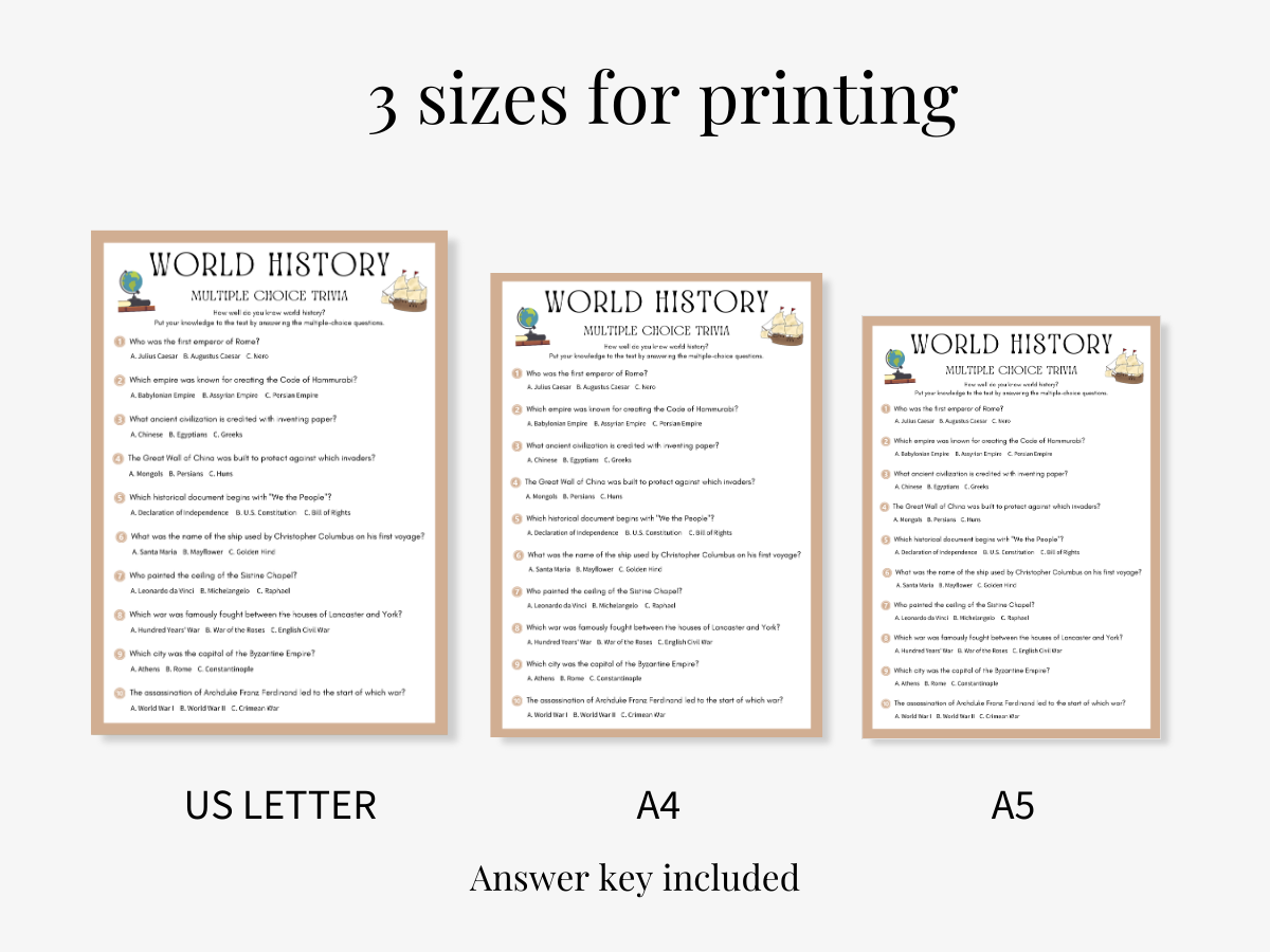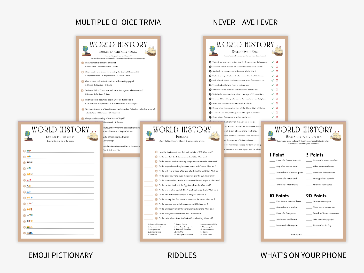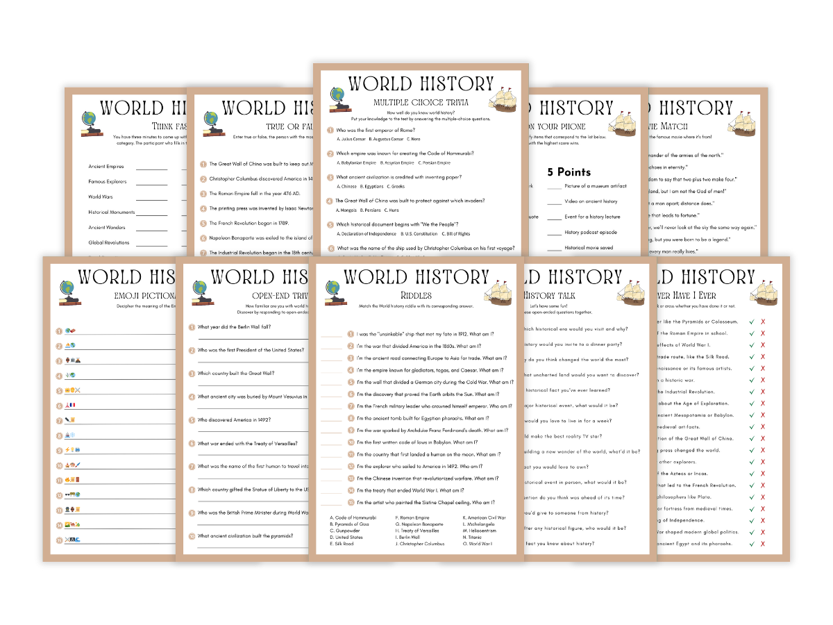 The World History 10 Games Bundle Printable is more than just a set of games—it’s a fantastic way to test knowledge, spark curiosity, and bring history to life. Whether you’re teaching a lesson, hosting a trivia night, or enjoying a family game, these printable games will make learning history an unforgettable experience.